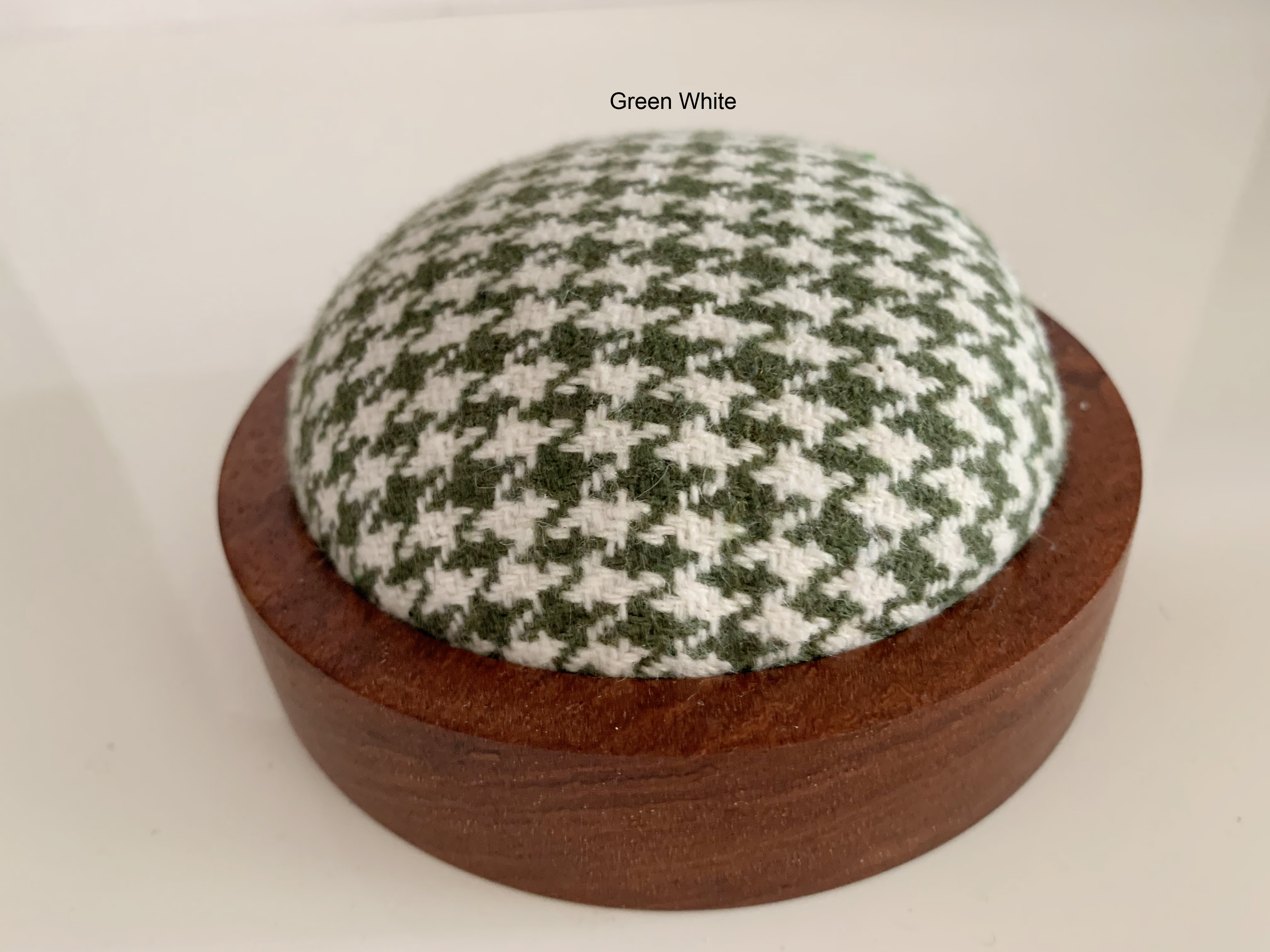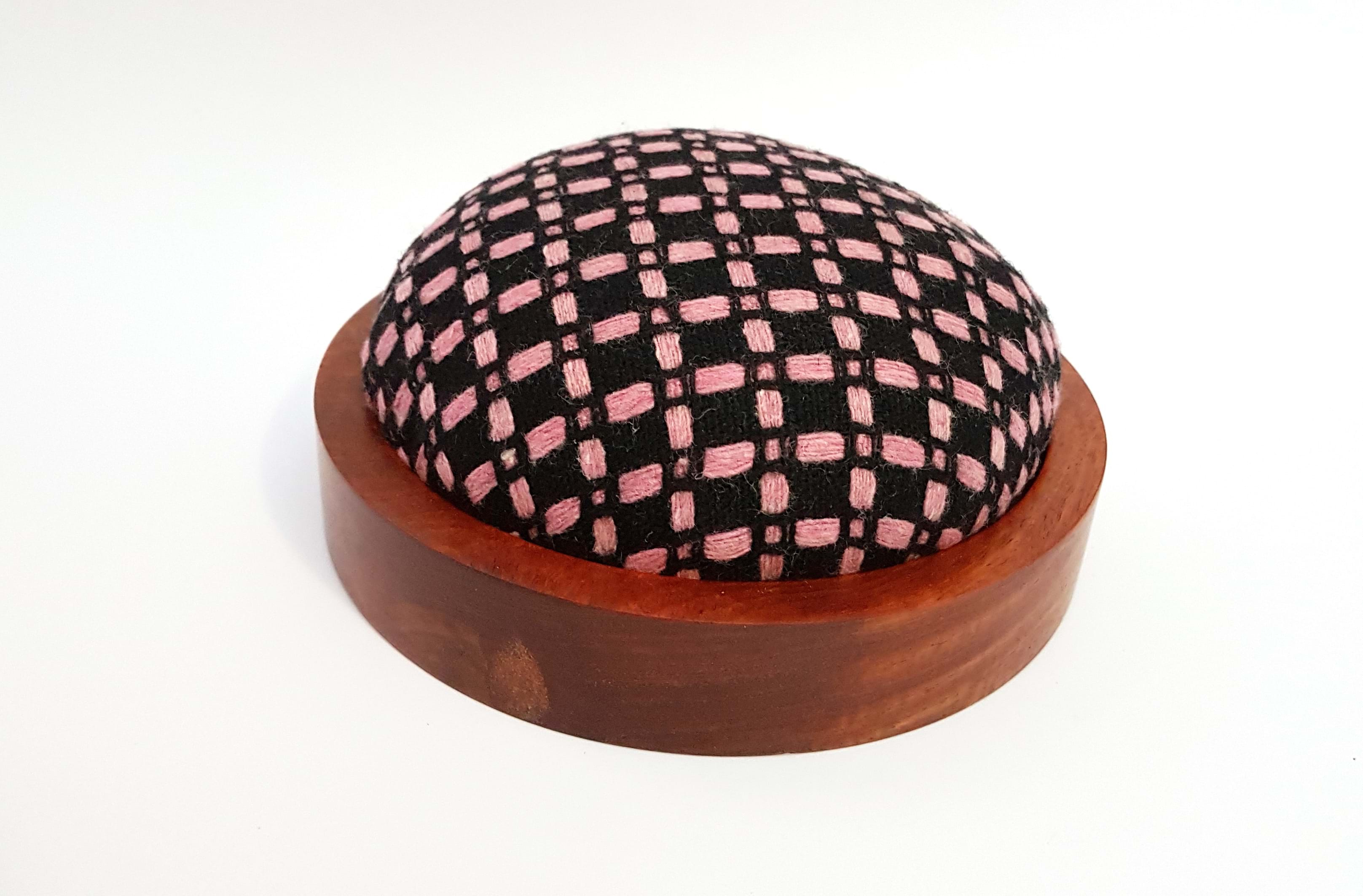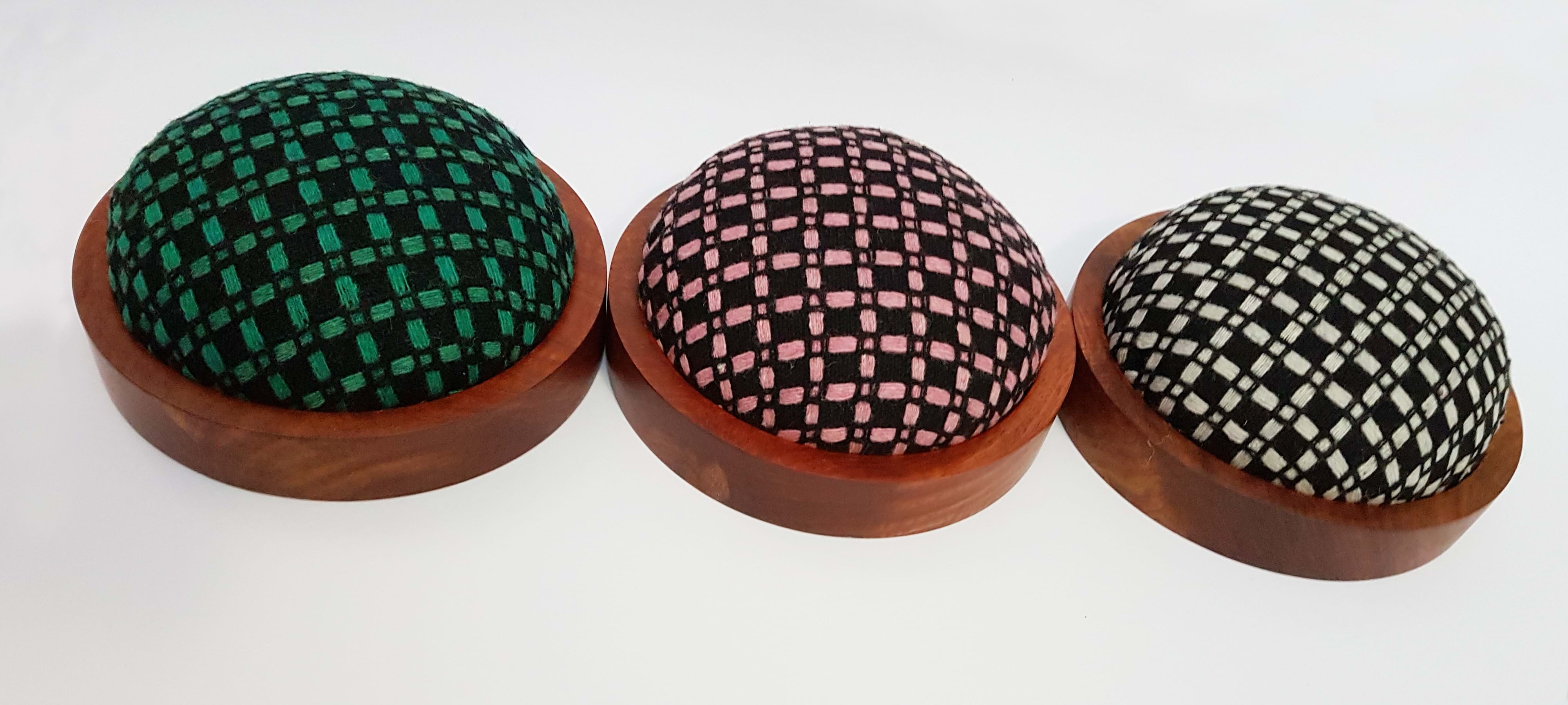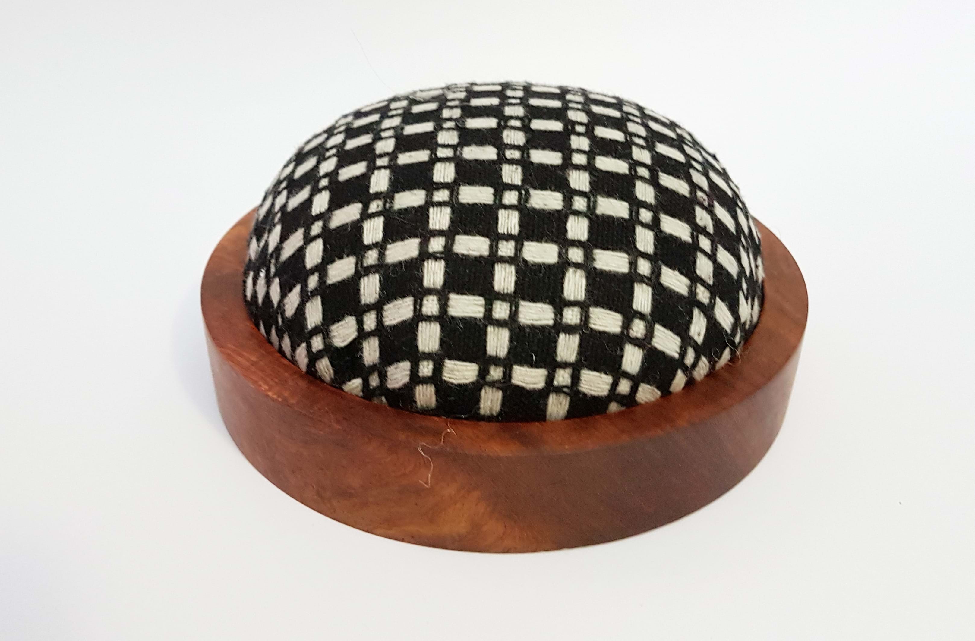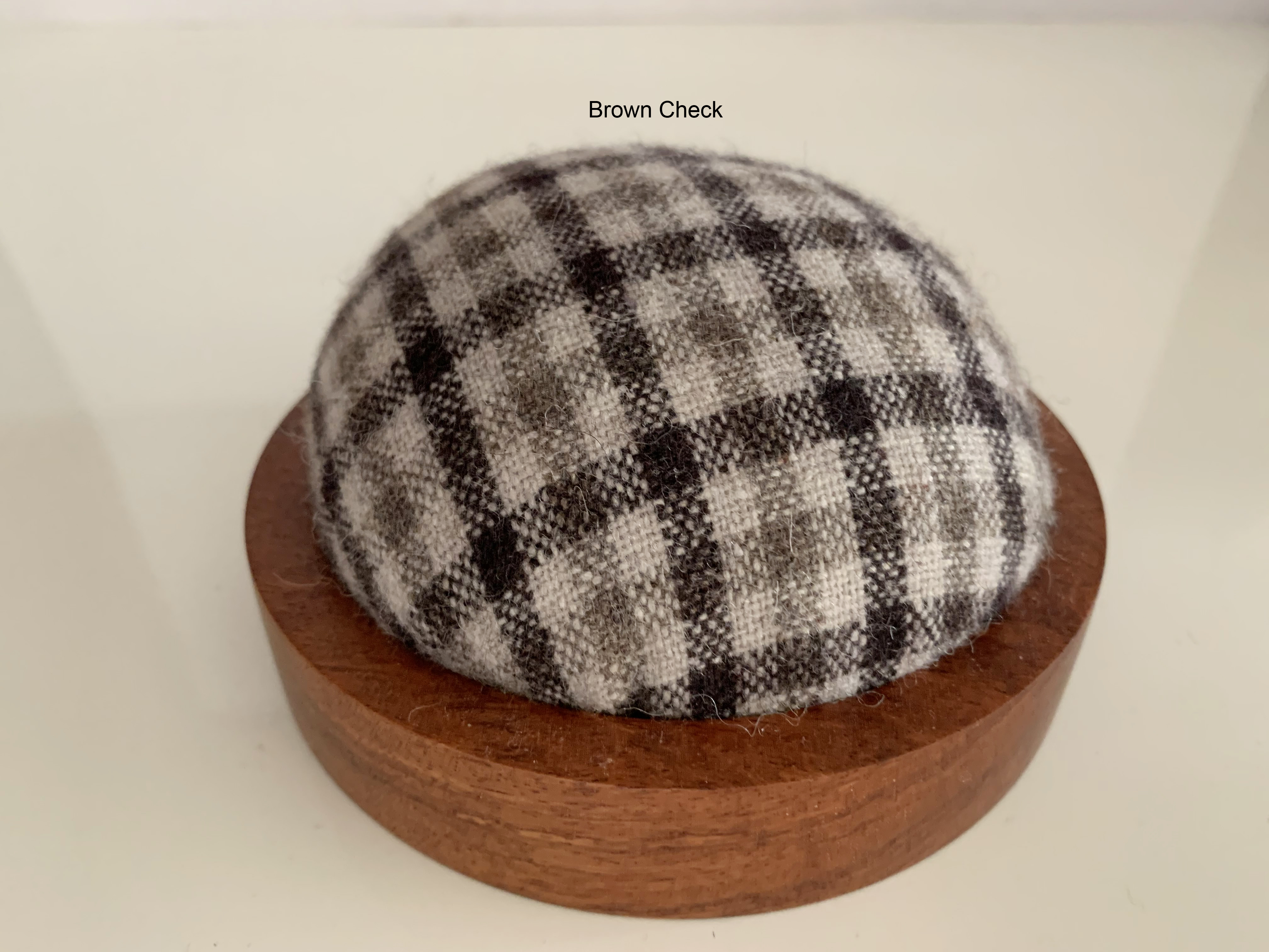 Wooden pincushion base are made of Padauk wood. The fabric cushion are handmade individually to fit nicely into the wooden base. Fabric made of Wool Tweed Weaved Check.