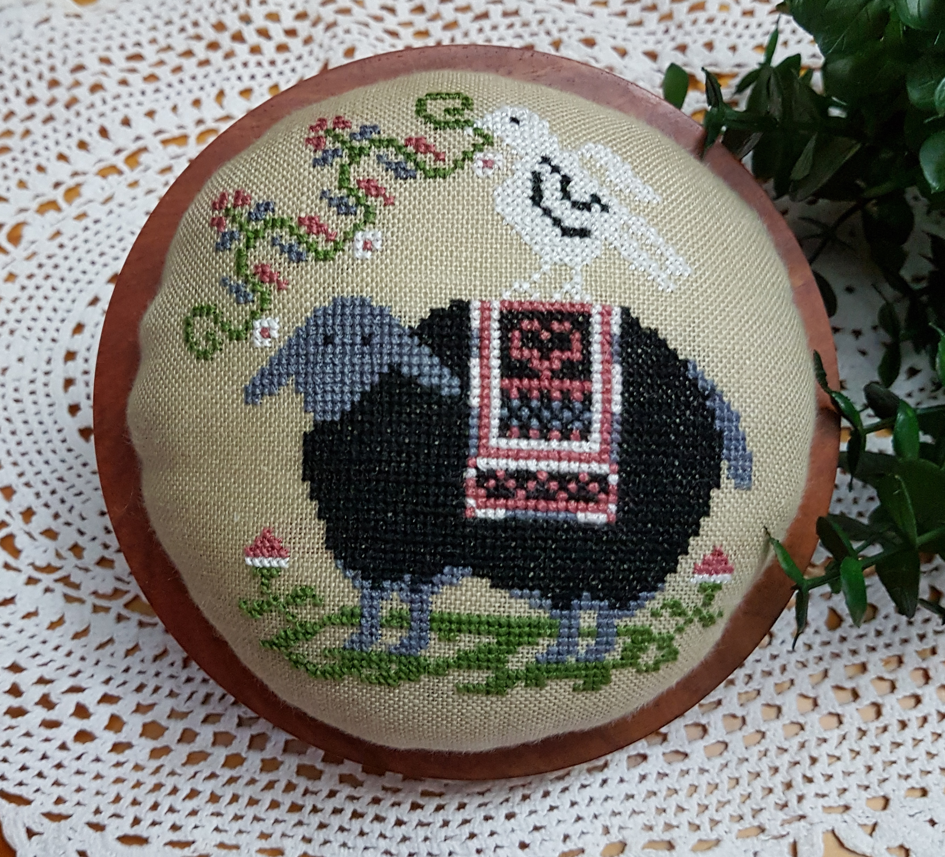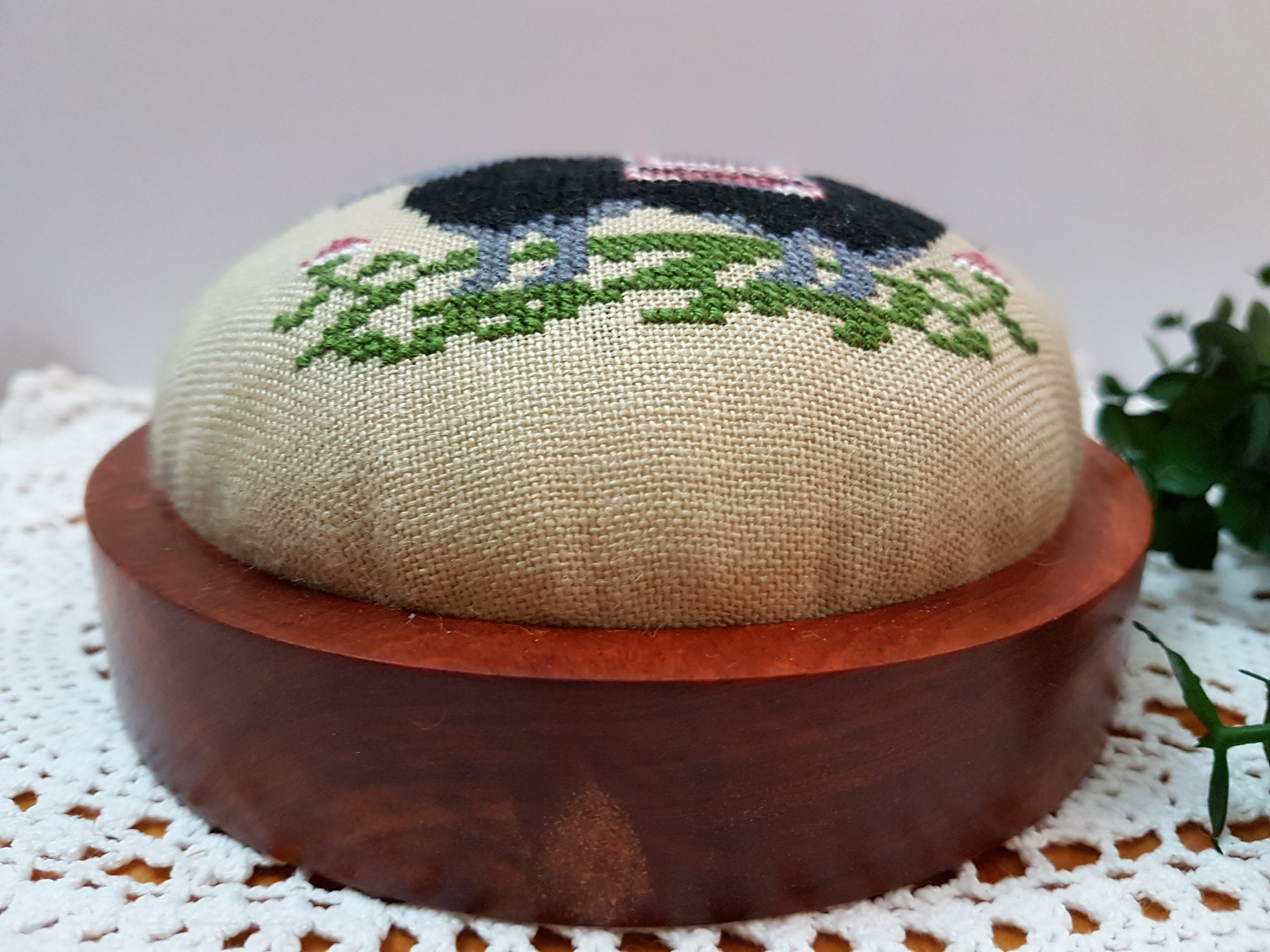 Model was stitched on 32 Count Golden French Linen and DMC Threads.